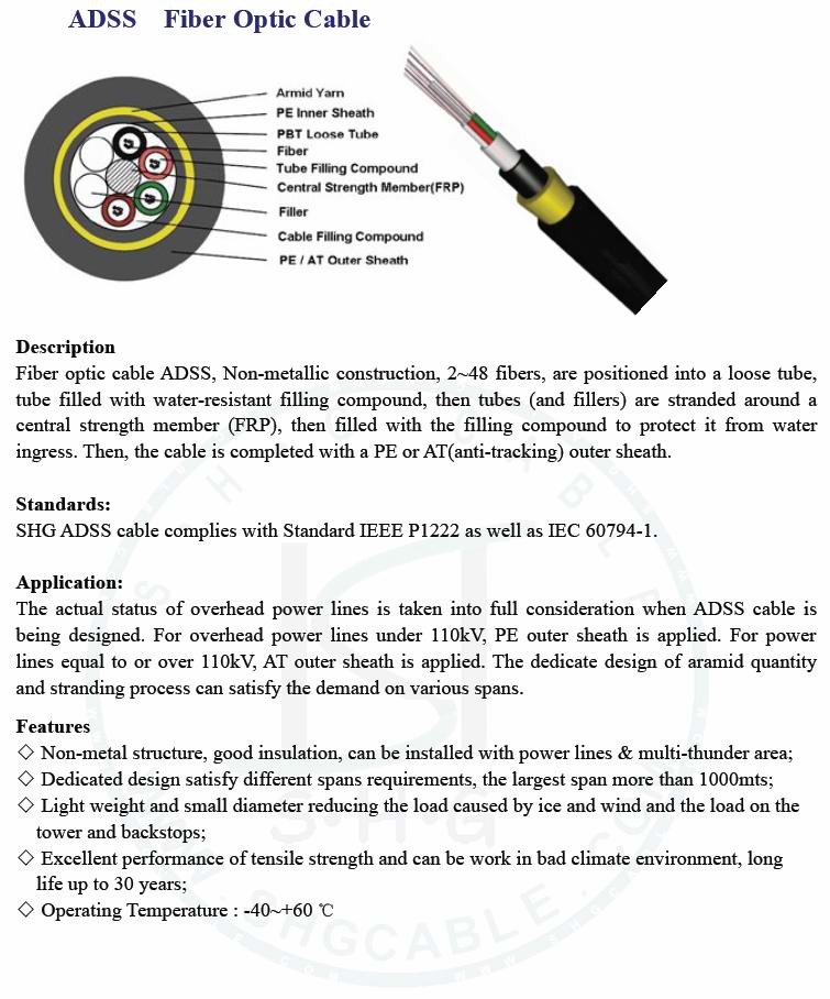 ADSS fiber optic cable, Non-metallic construction, 2~48 fibers, are positioned into a loose tube, tube filled with water-resistant filling compound, then tubes (and fillers) are stranded around a central strength member (FRP), then filled with the fi..