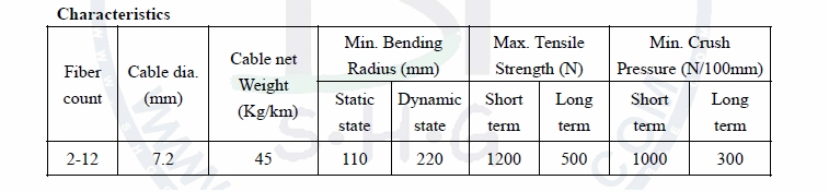 GYFXTY, 2~12 fibers, jelly filled and fiber contained central loose tube, two parallel steel wires, PE outer sheath. Suitable for duct or aerial application. Tubes contain optical fibers colour coded as per color coding scheme. G652D SM fiber, detail..