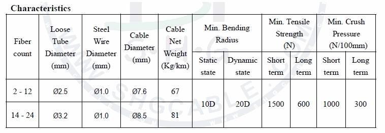 coated steel tape, two parallel steel wires 1.2mm, PE outer sheath. Suitable for duct or aerial application.