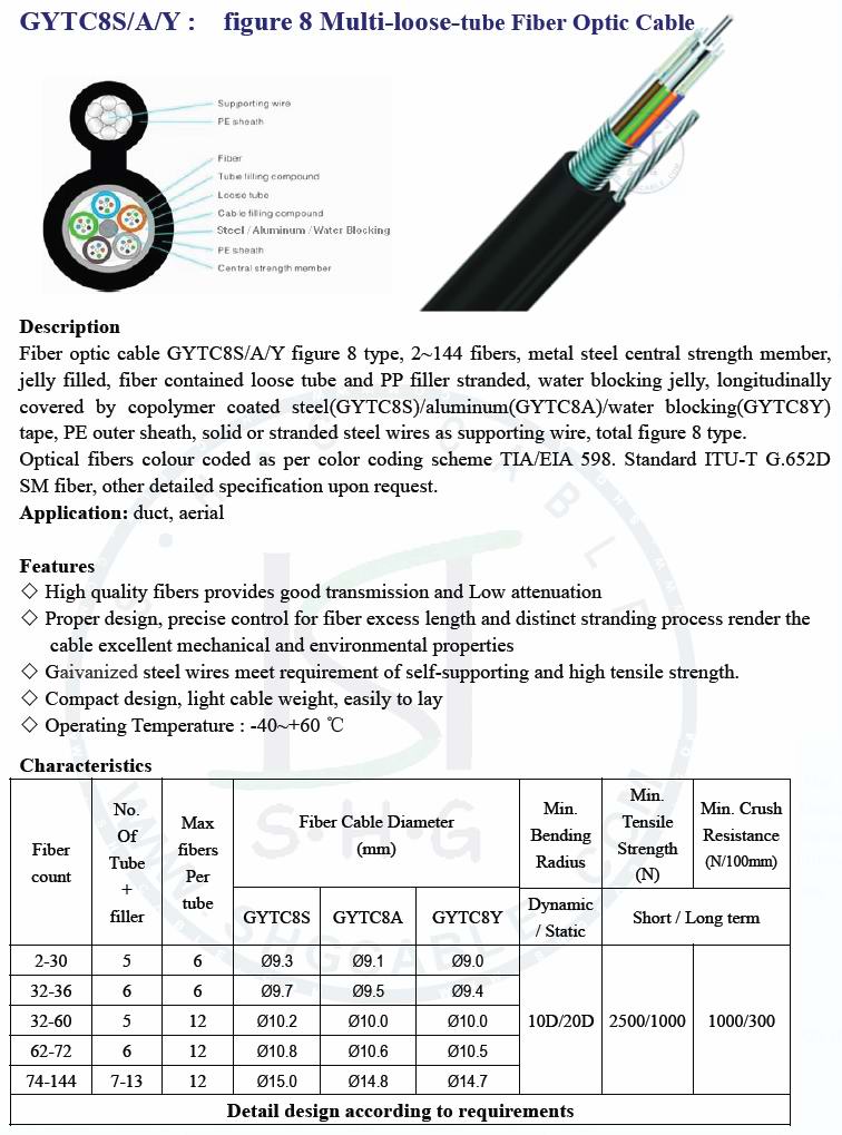 Aerial figure 8 type GYTC8S/A/Y fiber cable, multi-loose tube, 2~144 fibers, metal steel strand central strength member, jelly filled, fiber contained loose tube and PP filler stranded, water blocking jelly, longitudinally covered by copolymer coated..