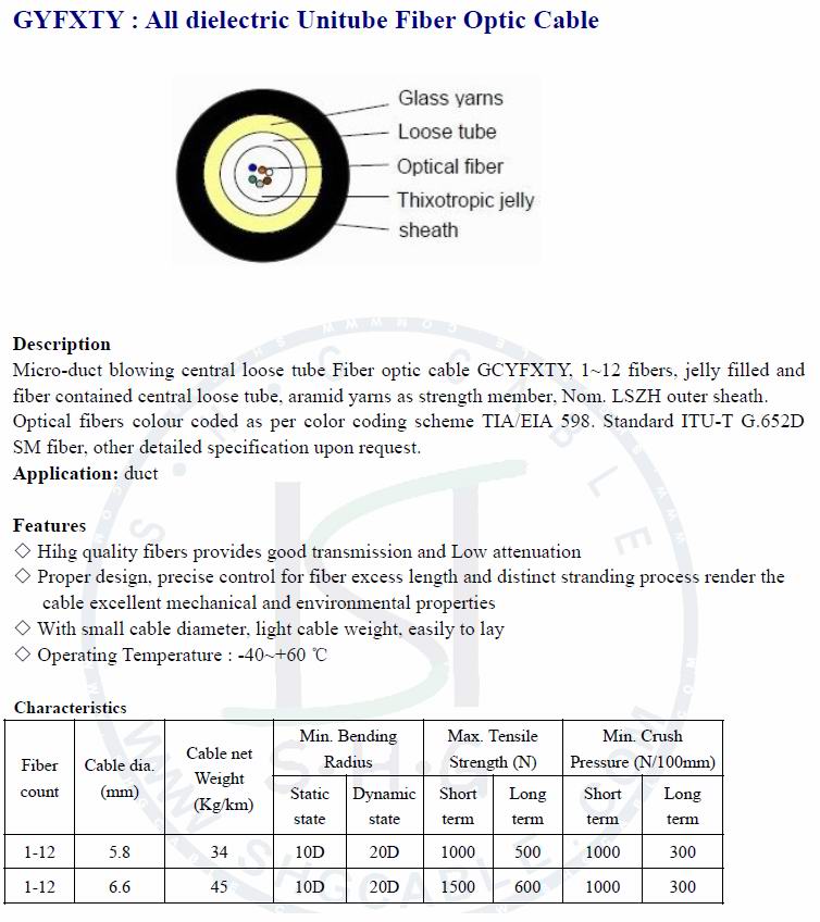GYFXTY, 2~12 fibers, jelly filled and fiber contained central loose tube, two parallel steel wires, PE outer sheath. Suitable for duct or aerial application. Tubes contain optical fibers colour coded as per color coding scheme. G652D SM fiber, detail..
