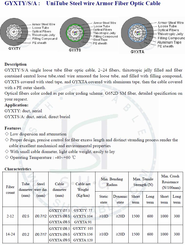 GYXTY/GYXTS/GYXTA, 2~12 fibers, jelly filled and fiber contained central loose tube, copolymer coated steel tape, PE outer sheath. Suitable for duct or aerial application. Tubes contain optical fibers colour coded as per color coding scheme. G652D SM..