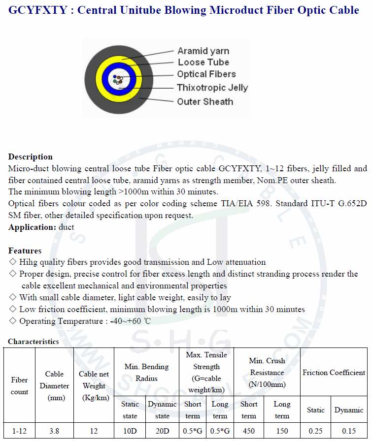Micro-duct blowing central loose tube Fiber optic cable GCYFXTY, 1~12 fibers, jelly filled and fiber contained central loose tube, aramid yarns as strength member, Nom.PE outer sheath. The minimum blowing length >1000m within 30 minutes. Application:..
