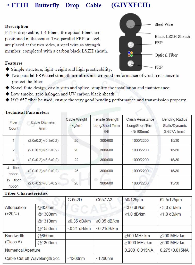 FTTH drop cable, 1-4 fibers, the optical fibers are positioned in the center. Two parallel FRP or steel are placed at the two sides, a steel wire as strength member, completed with a carbon black LSZH sheath.