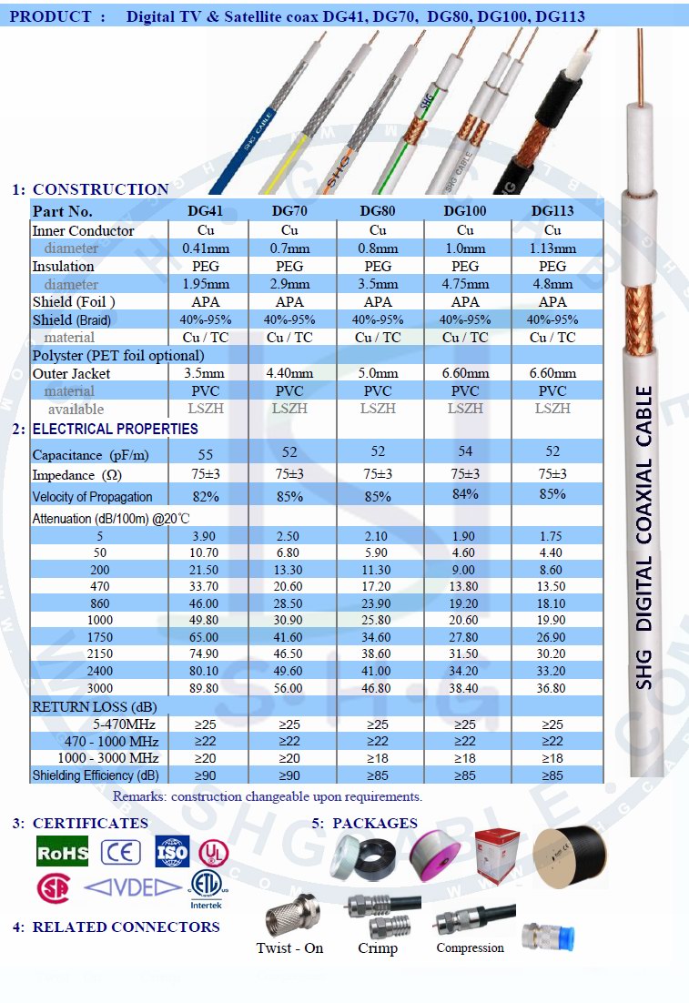 Digital 75 ohms coaxial cable, sweep test to 3000MHz. 1. Inner Conductor: Bare Copper or CCS 2. Insulation: PEG (foam PE) insulation 3. Shield(Foil): Cu foil or APA foil 4. Braid: Cu / Tin Cu / CCA / Al. 5. PET: optional..