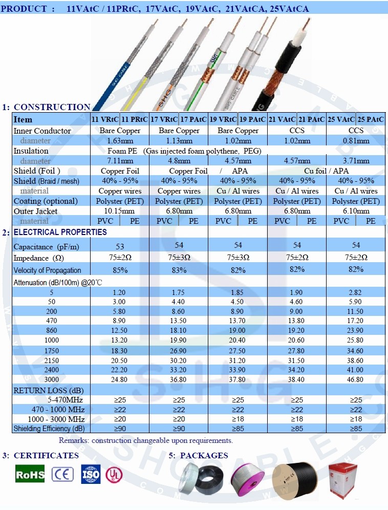 Digital 75 ohms coaxial cable, sweep test to 3000MHz. 1. Inner Conductor: Bare Copper or CCS 2. Insulation: PEG (foam PE) insulation 3. Shield(Foil): Cu foil or APA foil 4. Braid: Cu / Tin Cu / CCA / Al. 5. PET: optional..