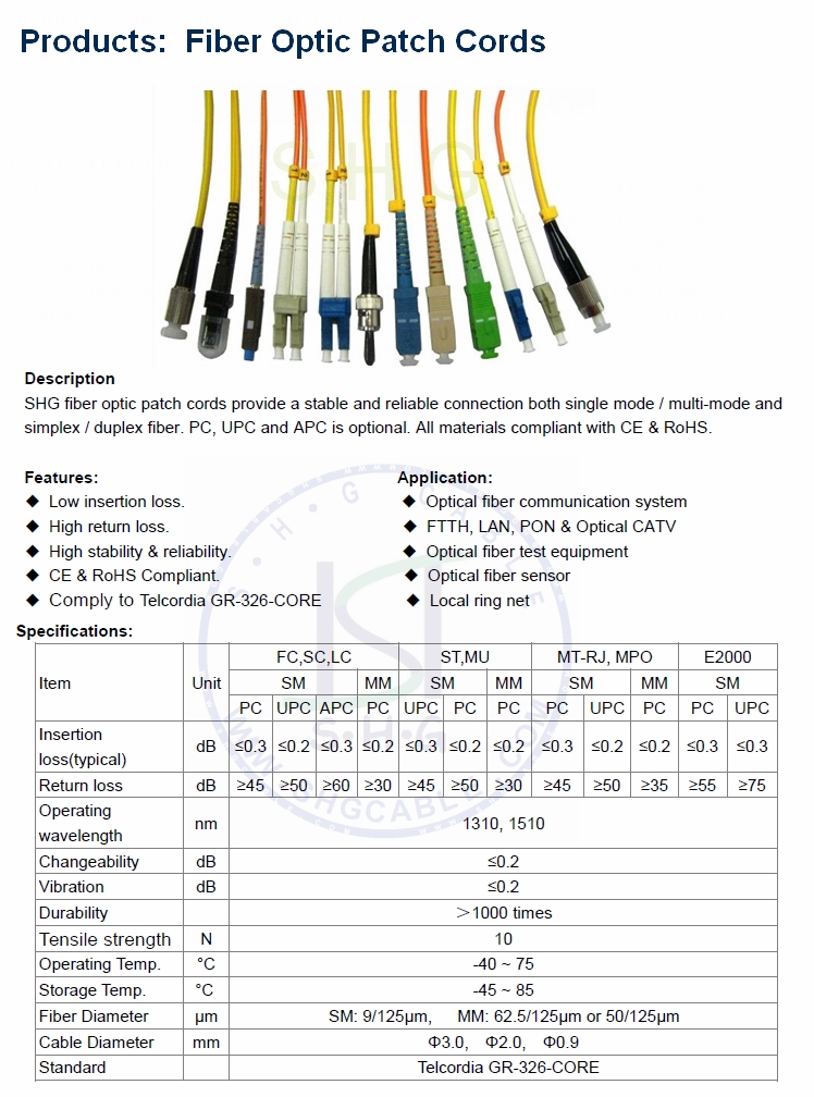 SC/FC/LC/ST/MU/E2000/MPO, SHG fiber optic patch cords provide a stable and reliable connection both single mode / multi-mode and simplex / duplex fiber. PC, UPC and APC is optional. Comply to Telcordia GR-326-CORE standard. All materials compliant wi..