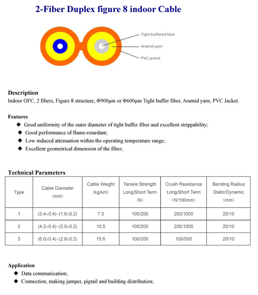 Indoor OFC,2 fibers,Figure 8 structure.¦Õ900¦Ìm or ¦Õ600¦Ìm Tight buffer fiber,Aramid yarn,PVC Jacket