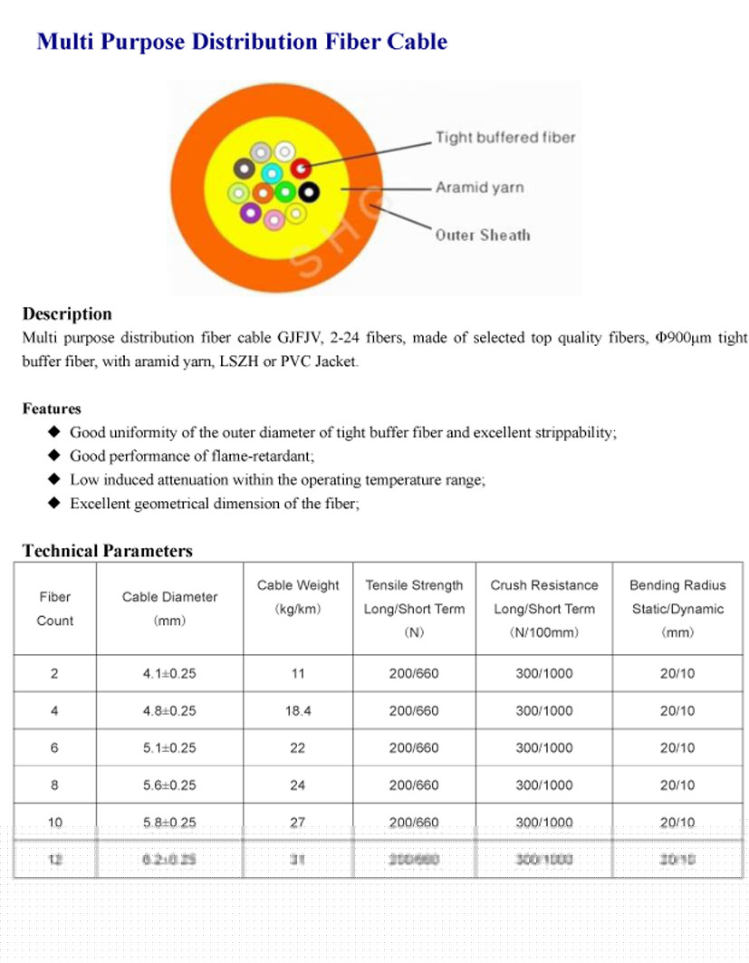 Multi purpose distribution fiber cable GJFJV,2-24 fibers,made of selected top quality fibers,¦Õ900¦Ìm tight buffer fiber,with aramid yarn,LSZH or PVC jacket