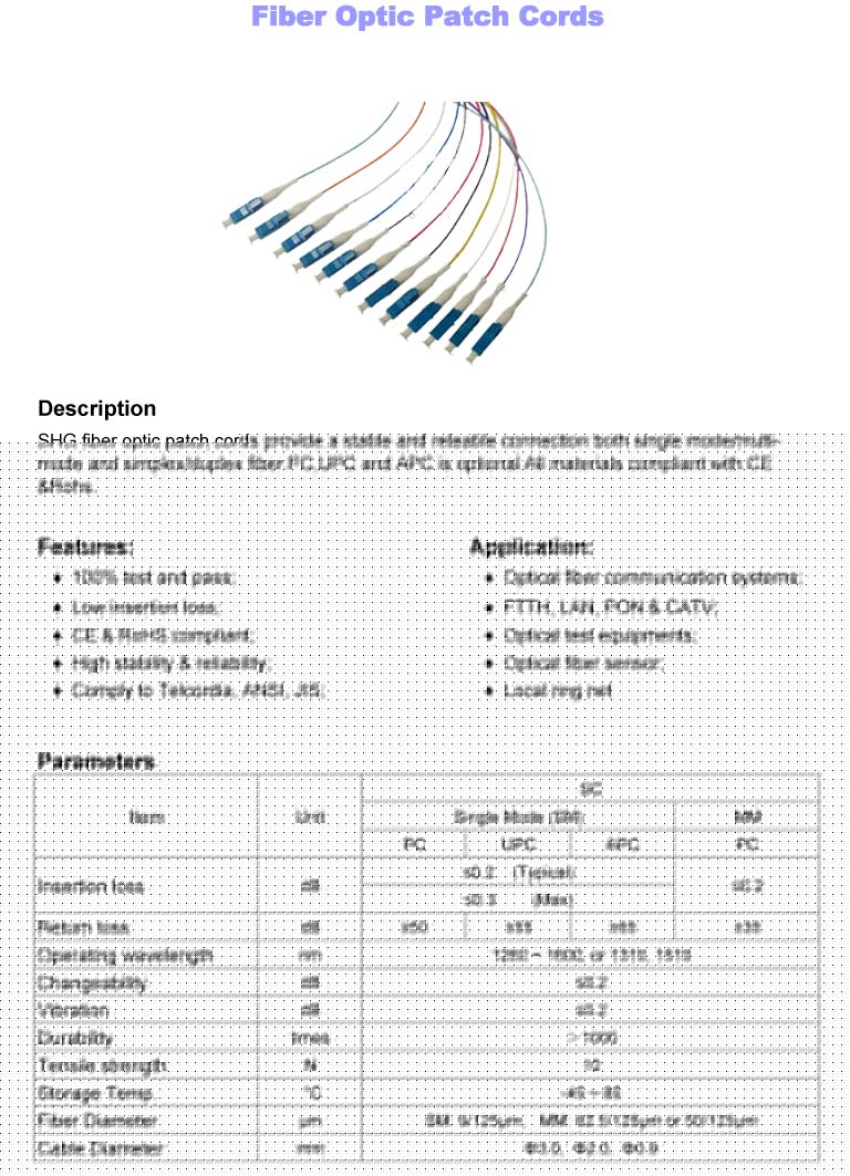 SHG fiber optic patch cords provide a stable and reliable connection both single mode / multi-mode and simplex / duplex fiber. PC, UPC and APC is optional. Comply to Telcordia GR-326-CORE standard. All materials compliant with CE & RoHS.