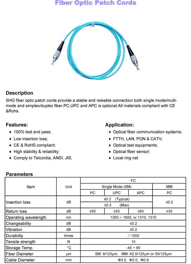 FC/Upc, SHG fiber optic patch cords provide a stable and reliable connection both single mode / multi-mode and simplex / duplex fiber. PC, UPC and APC is optional. Comply to Telcordia GR-326-CORE standard. All materials compliant with CE & RoHS.