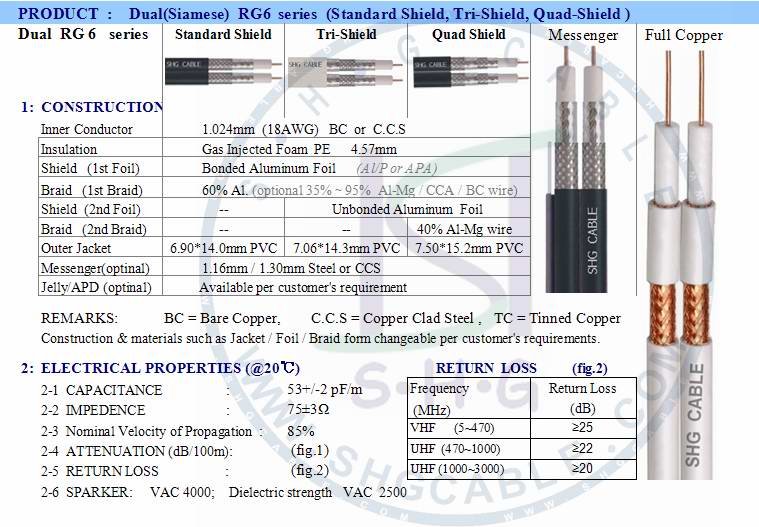 RG6 dual shield cable, 18AWG copper or CCS conductor, 110% Foil plus 60% mesh, low attenuation, high return loss.