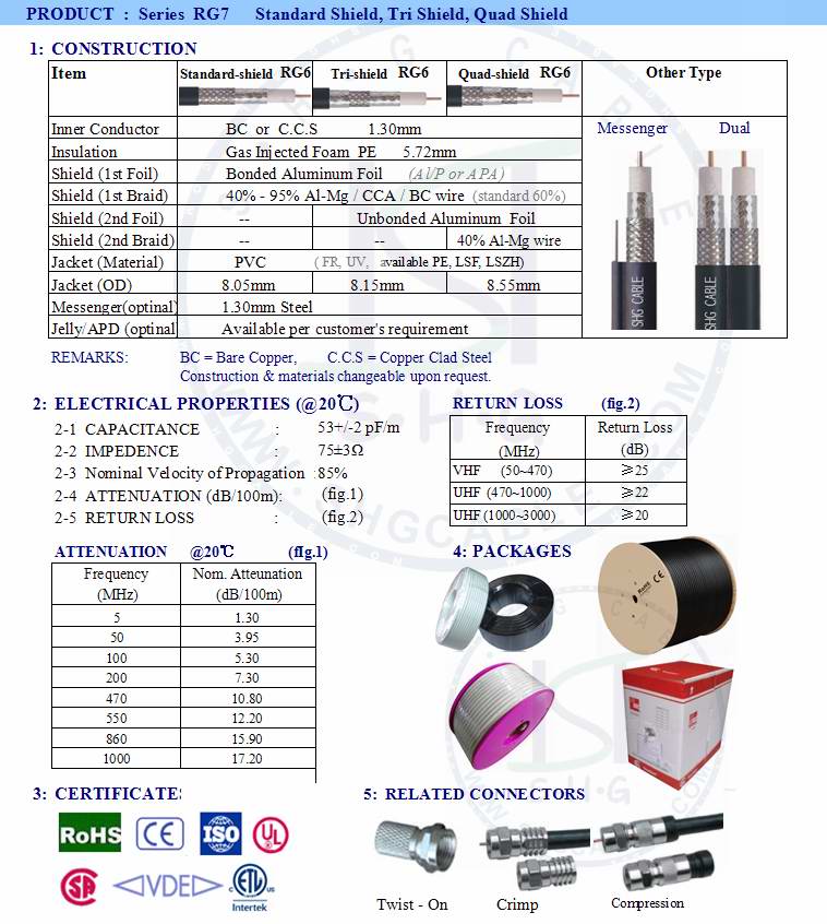 RG7/U series CATV Coaxial cable, swept test up to 3.0 GHz, solid 16 AWG BC/ CCS center conductor,