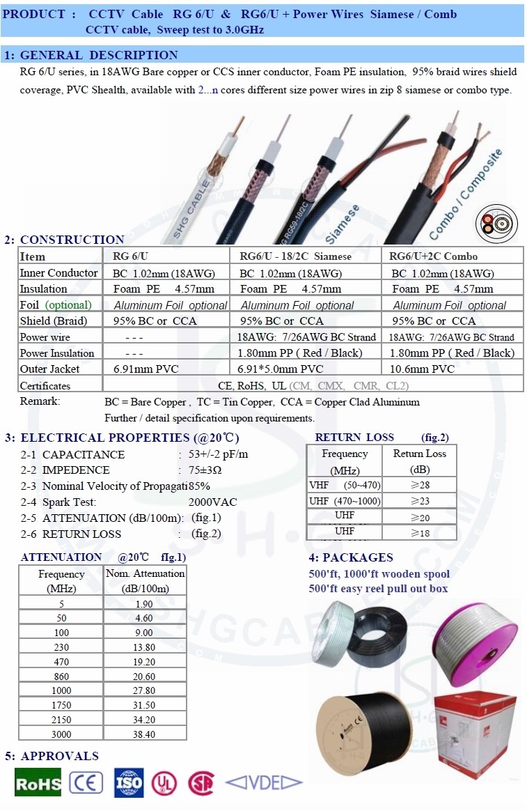 RG6/U, RG6/U-18AWG/2C siamese, RG6/U+Power Combo 1. Inner Conductor: 18AWG Bare Copper or CCS 2. Insulation: Foam PE 3. Shield (Foil): optional 4. Shield (Braid): 85% - 95% Cu / Tin Cu / CCA 5. Jacket: PVC / LSZH ..