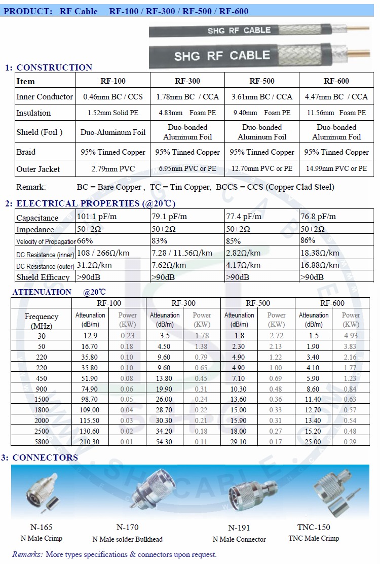 50 ohms RF cable RF100 RF300 RF500 RF600, compare to LMR series cables, low loss, high return loss.