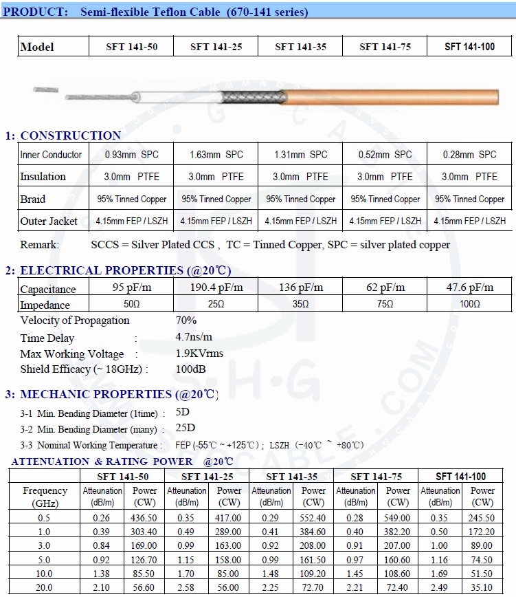 Semi-flexible 670-141 series Teflon cables, use silver plated CCS or copper, PTFE insulation, 95% coverage braid Silver plated Cu, FEP Jacket.