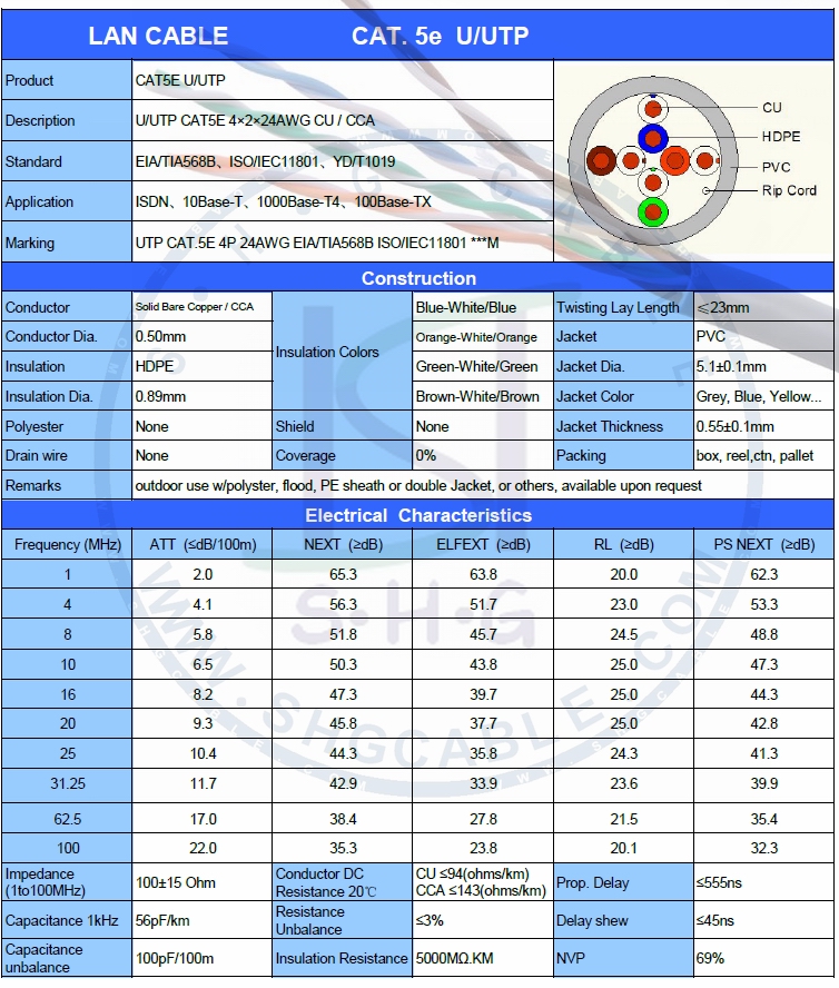 4 pairs Cat. 5e UTP cable, fluke pass. Standards: EIA/TIA568B¡¢ISO/IEC11801¡¢YD/T1019 Application: ISDN¡¢10Base-T¡¢1000Base-T4¡¢100Base-TX Construction: 4 pair 24AWG bare copper or CCA + HDPE Insulation + Ripcord + Jacket: PVC, LSZH, PE..