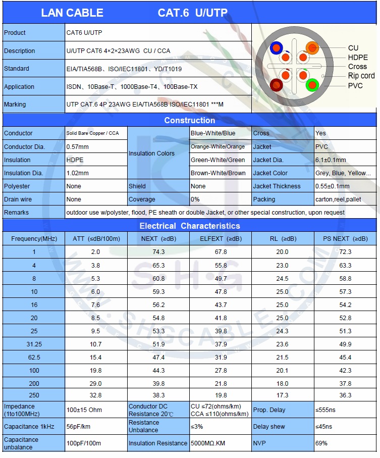 4 pairs Cat 6 UTP cable, fluke pass. 1. Inner Conductor: 4 pair 23AWG bare copper or CCA 2. Insulation: HDPE 3. Cross: Yes 4. Ground wire: No 5. ripcord: Yes 6. Jacket: PVC, LSZH, PE optional Standards: E..