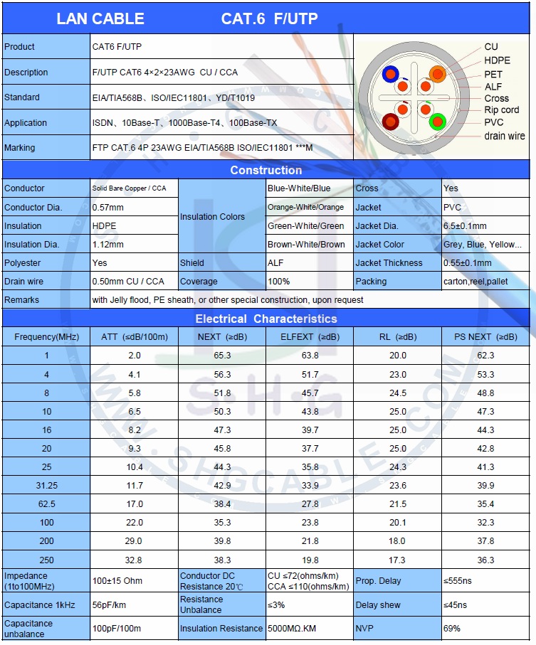4 pairs Cat. 6 FTP cable, fluke pass. 1. Inner Conductor: 4 pair 23AWG bare copper or CCA 2. Insulation: HDPE 3. Shield: Foil 4. Ground wire: Cu / Tin Cu 5. Jacket: PVC, LSZH, PE optional Standards: EIA/TIA568B¡¢..