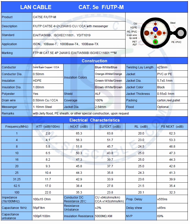 4 pairs Cat. 5e FTP cable, fluke pass. 1. Inner Conductor: 4 pair 24AWG bare copper or CCA 2. Insulation: HDPE 3. Shield: Foil + Cu / Tin Cu Ground wire: 5. Messenger: Steel 6. Jacket: PE, PVC, LSZH optional St..