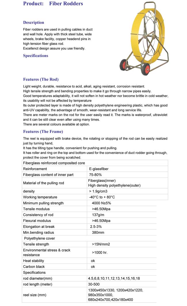Fiber rodders are used in pulling cables in duct and wall hole.Apply with thick steel tube,wide wheels,brake facility,copper headend pins in high tension fiber glass rod.